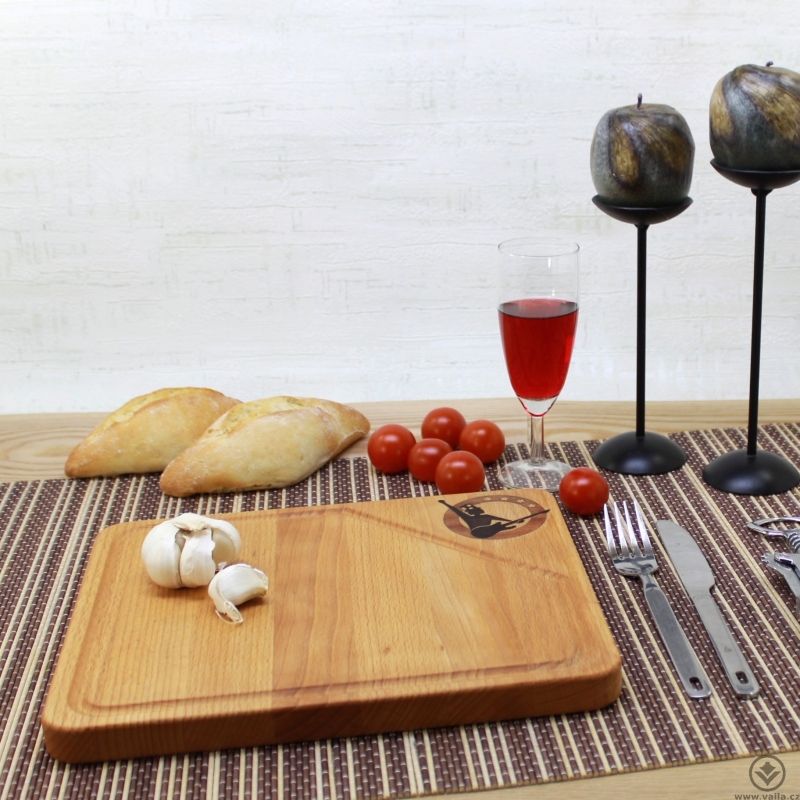 Dřevěné kuchyňské prkénko z bukového masivu. Motiv je vytvořen intarzií, vložením vrstvy exotického dřeva, to zajistí motivu jeho barevnou stálost i použitelnost pro krájení nožem. Z jedné strany je opatřeno odtékací drážkou, takže vám šťáva z masa a ovoce neuteče. Ideální pro krájení a servírování pokrmů, podávání steaků, kolena nebo přípravu zeleninových a ovocných salátů. Prkénko je ošetřeno olejem na dřevo ve styku s potravinami.
