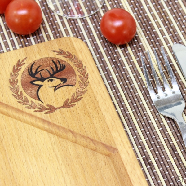 Dřevěné kuchyňské prkénko z bukového masivu. Motiv je vytvořen intarzií, vložením vrstvy exotického dřeva, to zajistí motivu jeho barevnou stálost i použitelnost pro krájení nožem. Z jedné strany je opatřeno odtékací drážkou, takže vám šťáva z masa a ovoce neuteče. Ideální pro krájení a servírování pokrmů, podávání steaků, kolena nebo přípravu zeleninových a ovocných salátů. Prkénko je ošetřeno olejem na dřevo ve styku s potravinami.